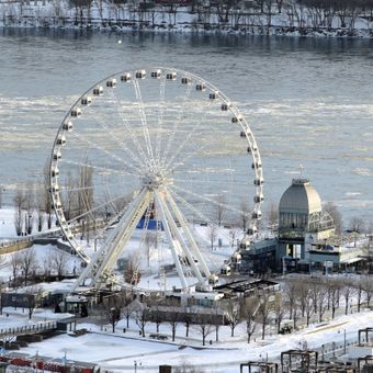La Grande Roue de Montréal s'élève à 60 mètres au-dessus du fleuve Saint-Laurent, avec 42 nacelles climatisées équipées de panneaux en verre anti-UV.