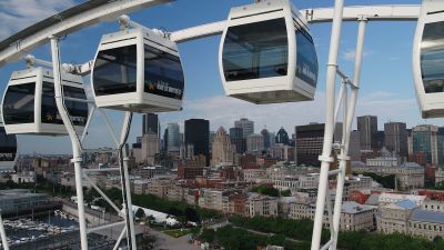 Depuis les cabines d'observation, les passagers contemplent la silhouette urbaine moderne aux côtés des sites historiques comme le Mont Royal, le pont Jacques-Cartier et le Marché Bonsecours.