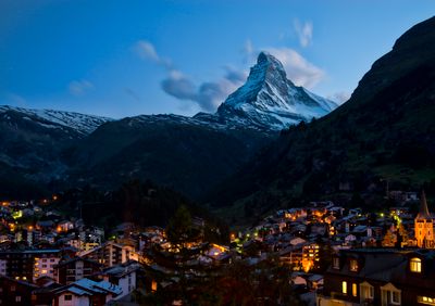 Zermatt se trouve à 1.608 mètres d'altitude au bout de la vallée de Matter, entouré par les sommets du Mont Rose et du Cervin. La station s'étend le long de la rivière Matter Vispa, avec des hôtels et des boutiques le long de la rue principale Bahnhofstrasse.