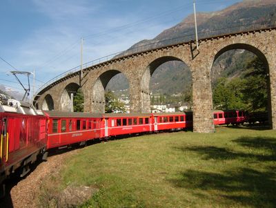 La ligne ferroviaire de la Bernina relie Saint-Moritz en Suisse à Tirano en Italie à travers 13 tunnels et 52 viaducs des Alpes suisses.