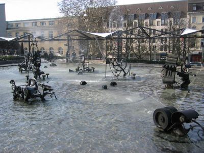 Les sculptures métalliques de la Fontaine Tinguely créent des motifs aquatiques continus grâce aux mécanismes rotatifs près du Théâtre Basel.