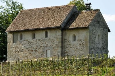 La chapelle en pierre présente des arcs en plein cintre caractéristiques et des murs épais, se dressant sur le paysage du lac de Zurich.