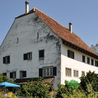 Oetikon, Häuserzeile am Hafen mit patriotischem Denkmal und Schiffstation