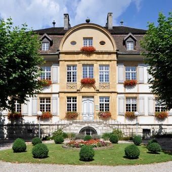 Le domaine Rockhall comprend un manoir principal et deux villas latérales entourés de jardins et de vignobles dans le nord de Bienne.