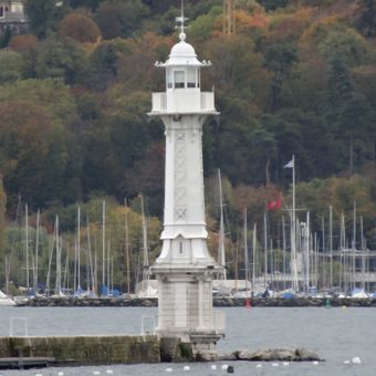Le Phare des Pâquis s'élève à 18.70 mètres au-dessus du lac Léman, construit en pierre avec une lumière blanche et un signal vert.