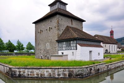 Abbey governor's office with castle tower and moat, Château médiéval à douves à Pfäffikon, Suisse.