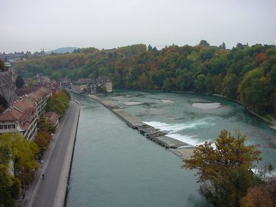Le barrage Mattenschwelle s'étend sur 320 mètres le long de la rivière Aare, avec une hauteur de 3 mètres et une largeur de 13 mètres.
