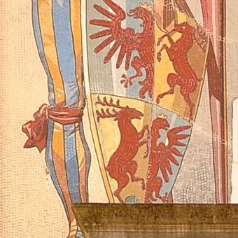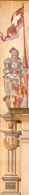 Supporter with the coat of arms of the von Scherrer auf Castell, mosaic to the left of the entrance of Curti House in Rapperswil SG, Switzerland