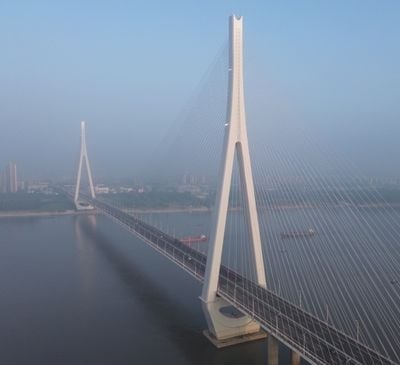 Le pont d'Edong sur le fleuve Yangtsé est une structure à haubans en béton mesurant 1 486 mètres de longueur totale avec une travée principale de 926 mètres.
