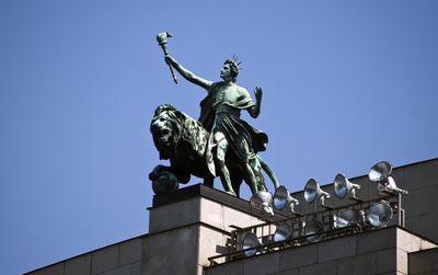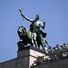 Lion and genius on Česká národní banka building in Prague, statue in Prague
