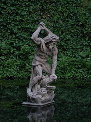 La statue montre Hercule combattant l'Hydra, intégrant la mythologie antique dans le paysage du jardin. Elle témoigne de la manière dont les histoires classiques ont été incorporées à la conception des espaces verts européens.