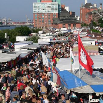 Le Altonaer Fischmarkt s'étend sur 62,800 mètres carrés le long de l'Elbe, réunissant 57 marchands qui vendent du poisson frais, des fruits, des fleurs et des spécialités locales.