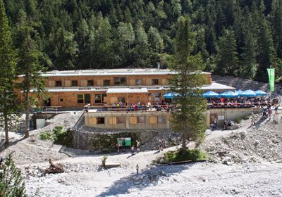 Le refuge Höllentalanger se dresse à 1387 mètres entre les crêtes de Höllental-Blassen et Waxenstein-Riffelwand dans les Alpes bavaroises.