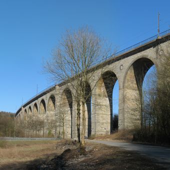 Le viaduc d'Altenbeken est un pont ferroviaire en calcaire qui s'étend sur environ 482 mètres à travers le paysage. Il s'élève d'environ 35 mètres au-dessus de la vallée de la Beke en utilisant une série d'arcs pour supporter les voies ferrées.