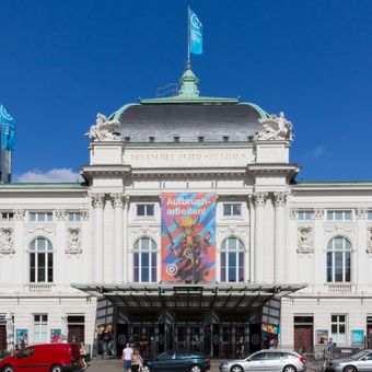 Le Deutsches Schauspielhaus est un bâtiment théâtral néo-baroque dans le quartier St. Georg à Hambourg. La façade présente de riches décorations en stuc, tandis qu'à l'intérieur, des escaliers courbes mènent à plusieurs niveaux de balcons.