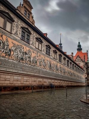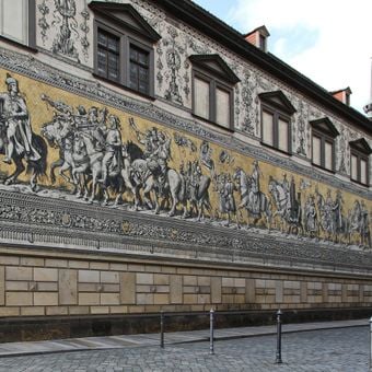 La Procession des Princes couvre 102 mètres du mur nord des écuries royales avec 24,000 carreaux en porcelaine de Meissen représentant les dirigeants saxons.
