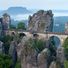 Bastei est une formation rocheuse en Suisse saxonne, Allemagne, s'élevant à 194 mètres au-dessus de l'Elbe. Les piliers de grès se sont formés par érosion hydrique sur des millions d'années, créant un ensemble relié de sommets et de pinacles.