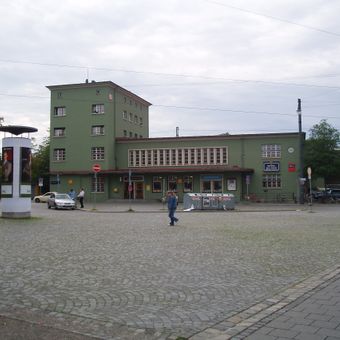 La gare Augsburg-Oberhausen présente une architecture de Nouvelle Objectivité avec quatre étages et de grandes fenêtres rectangulaires formant un motif symétrique.