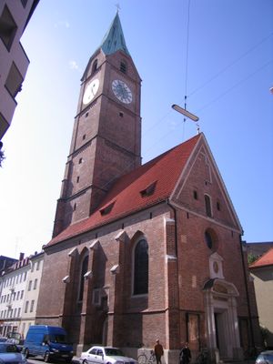 L'église présente des murs de briques non ornés, des voûtes gothiques et un haut clocher qui domine les bâtiments du centre de Munich.