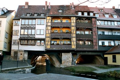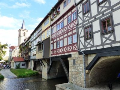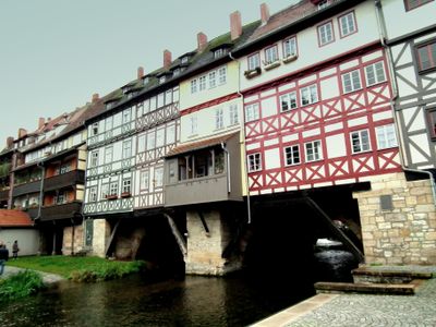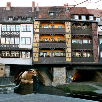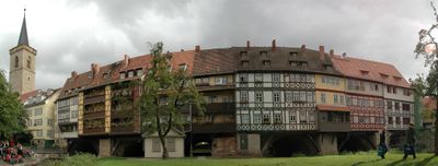 Le Krämerbrücke s'étend sur 79 mètres au-dessus de la rivière Gera avec 32 maisons à colombages alignées le long de ses côtés.