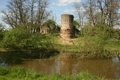 Le château se dresse sur une colline artificielle entre la rivière Nidder et Mühlgraben, avec des sections de murs restantes et une tour semi-circulaire.
