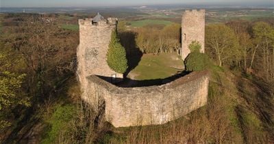 Le château d'Ebersburg se dresse à 689 mètres d'altitude sur une colline, avec des murs restants et une tour d'observation restaurée.