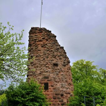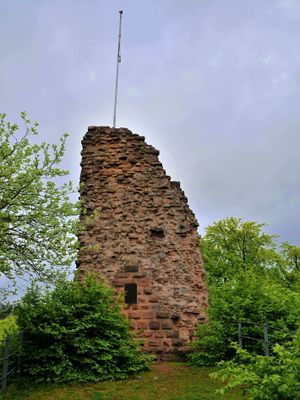 Les ruines du château restent accessibles par des sentiers de randonnée dans la Forêt Palatine, présentant des murs en pierre et des structures défensives préservées.
