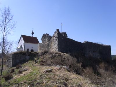 Les vestiges du château se dressent sur une crête de 675 mètres entourée par la rivière Lauchert, avec une tour résidentielle rectangulaire.