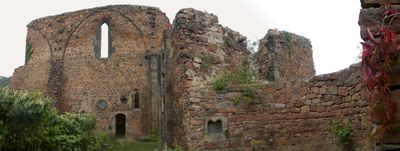 Les structures préservées comprennent des sections de l'église originale, des salles voûtées dans l'aile est et des caves de l'aile nord au bord du fleuve.