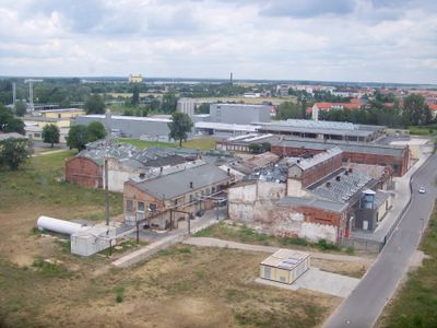 Le Eilenburger Chemiewerk constitue un site de fabrication industrielle avec des bâtiments dédiés à la production et au traitement chimique.
