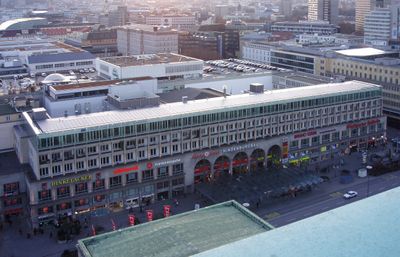 Le Hindenburgbau est un immeuble de commerce avec une structure en acier et un design néoclassique s'étendant sur six étages, abritant des bureaux et des commerces. Sa facade associe des matériaux de parement naturels avec des éléments modernes en acier et verre.