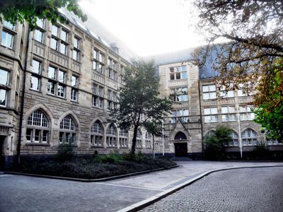 La tour originale au-dessus de l'entrée principale, détruite pendant les bombardements de 1945, n'a jamais été reconstruite après la Seconde Guerre mondiale.