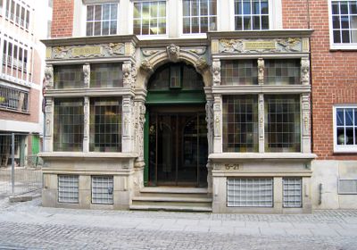 L'Essighaus est une maison marchande Renaissance dans le quartier Mitte de Brême, dotée d'éléments de facade restaurés et de fenêtres en saillie. La structure combine les espaces résidentiels et commerciaux sur plusieurs étages, illustrant la qualité architecturale d'un établissement d'un riche marchand du début du 17e siècle.