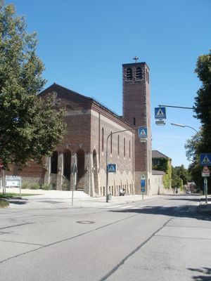 La Pallottinerkirche est un bâtiment de pierre de taille considérable avec des éléments architecturaux traditionnels bavarois présentant des façades soigneusement travaillées. L'intérieur est éclairé par de grandes fenêtres et montre une disposition spatiale avec un chœur clairement délimité et une nef principale.