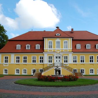 Le Gutshaus Döbbelin repose sur une base surélevée avec un toit mansardé et présente une projection centrale triaxiale des côtés cour et jardin.
