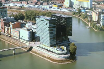 Hafenspitze Düsseldorf est un ensemble architecturel constitue de deux tours de 65 metres reliees par une structure de base dans le port des medias. La tour orientale accueille un hotel Hyatt tandis que la tour occidentale abrite des espaces de bureaux, avec des zones publiques accessibles entre et autour des structures.
