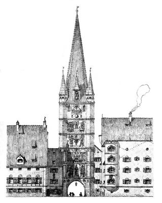 Le Kaufingertor était une tour-porte à quatre étages aux murs en pierre située entre la Kaufingerstraße et la Fürstenfelderstraße dans la vieille ville de Munich. Il servait de passage fortifié à une intersection majeure du centre-ville.