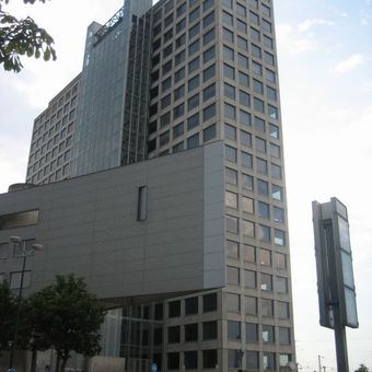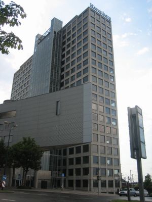 Le Harenberg City-Center comprend une tour de 21 étages reliée à une aile courbe par un hall central vitré sur Königswall.