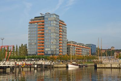 Le Hochhauscenter am Germaniahafen présente une tour de 14 étages avec des espaces de bureaux dans l'aile nord et 58 unités résidentielles orientées sud et ouest.