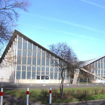 Le hall d'exposition de Magdeburg est une salle polyvalente moderne dans le quartier de Werder présentant une coque de béton distinctive en forme de paraboloïde hyperbolique. Le bâtiment offre des espaces intérieurs flexibles sans colonnes de soutien et accueille des expositions, des événements et des programmes culturels.