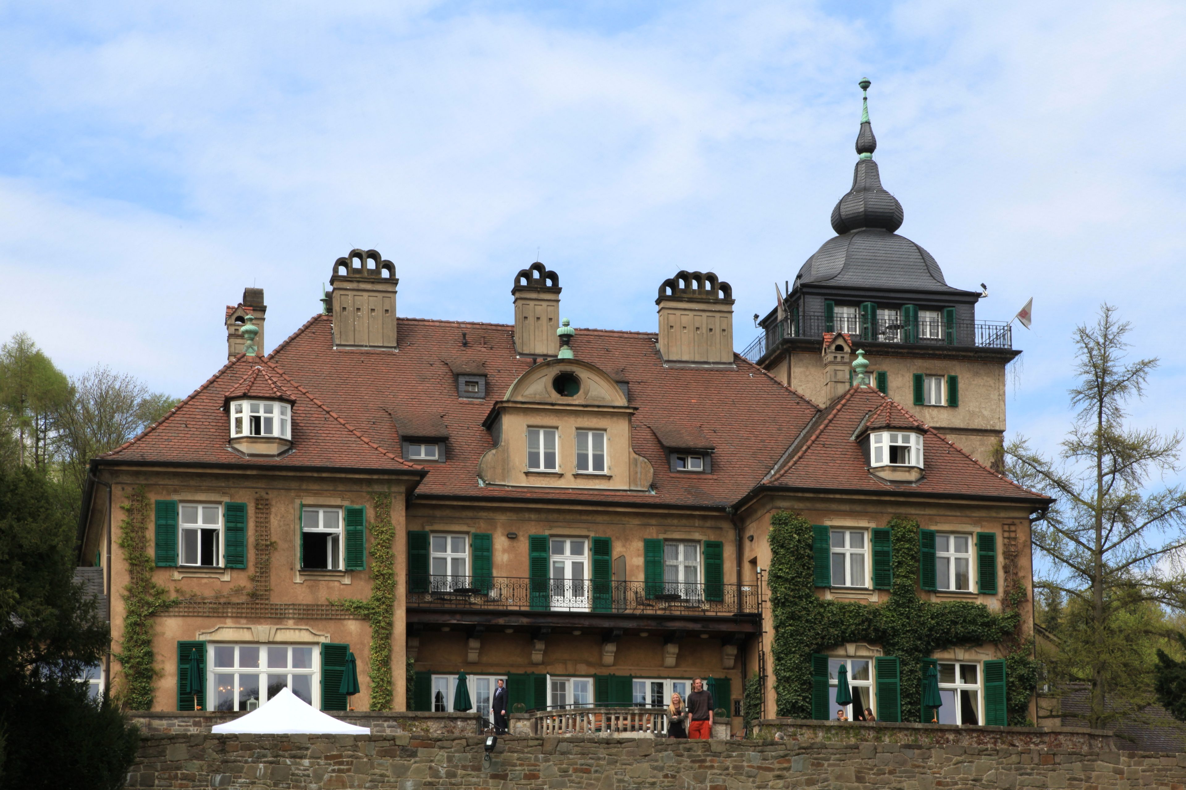 Les murs en pierre blanche du Schloss Lerbach s'élèvent parmi des jardins verts, présentant des fenêtres symétriques et des éléments architecturaux détaillés.
