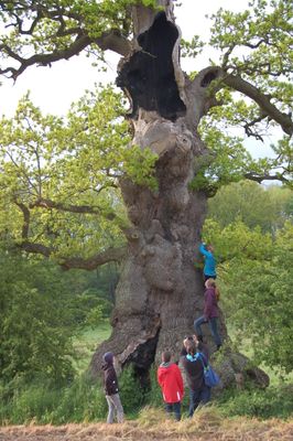 Le tronc massif s'est développé selon une histoire inhabituelle: le bétail en pâture a rongé à plusieurs reprises les jeunes pousses de l'arbre. Ces blessures répétées ont provoqué des schémas de croissance anormaux qui ont donné au chêne sa largeur exceptionnelle actuelle.