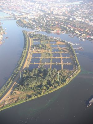Kaltehofe est une île de 60 hectares dans l'Elbe qui abrite un vaste système de filtration de l'eau avec plusieurs bassins et maisons de vannes. L'installation montre la solution d'ingénierie que Hambourg a développée au 19e siècle pour approvisionner ses habitants en eau propre.