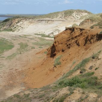 Le Morsum Kliff est une falaise sur l'île de Sylt d'environ 1800 mètres de longueur et d'environ 21 mètres de hauteur, affichant l'histoire de la Terre dans des couches colorées. L'argile foncée, le sable rouge, le kaolin blanc et le matériau jaune-brun forment des bandes alternées qui se lisent comme un manuel de géologie ouvert.