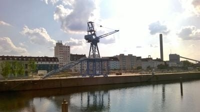 Le site était autrefois un port industriel pour les navires et le commerce, mais s'est transformé depuis les années 1990 en un quartier moderne a usage mixte. Ce passage d'un port actif à un quartier résidentiel et commercial définit aujourd'hui la rive du Main.