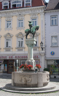 Le Postmichelbrunnen est une fontaine sur la place Fischbrunnenplatz présentant une statue en bronze d'un facteur à cheval avec des reliefs de pierre l'entourant. Les éléments sculptés affichent des scènes et des figures travaillées avec soin, créant un récit en couches gravé à la surface du monument.