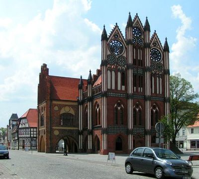 Le Rathaus Tangermünde est un bâtiment médiéval en brique rouge avec une façade de 24 mètres de haut décorée de frises ornementées, de contreforts polygonaux et d'arcades en arc brisé au rez-de-chaussée. A l'intérieur, il abrite les collections municipales avec des espaces d'exposition, tandis qu'un pilier central dans la salle supérieure soutient un plafond en voûte d'arête richement orné.