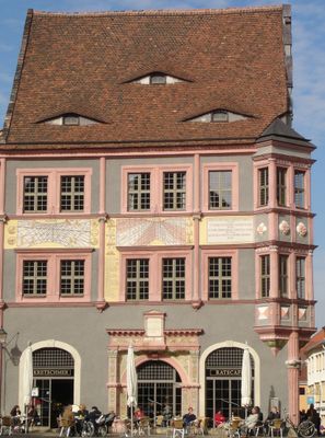 Bürgerhaus mit Ratsapotheke in geschlossener Bebauung, Eckhaus, dazu zwei Sonnenuhren Untermarkt 24