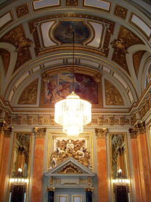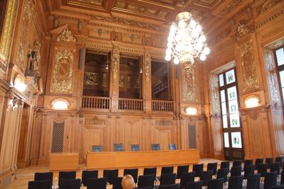 Les éléments architecturaux intègrent des symboles judiciaires dans les salles, des reliefs du plafond représentant les vertus judiciaires aux sculptures de l'escalier principal.