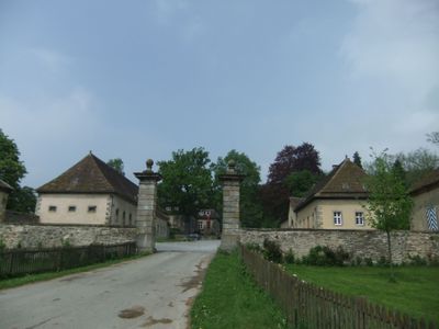La propriété comprend deux pavillons avec toits en tente du XVIIe siècle et d'anciennes écuries marquées aux emblèmes de la famille Donop.
